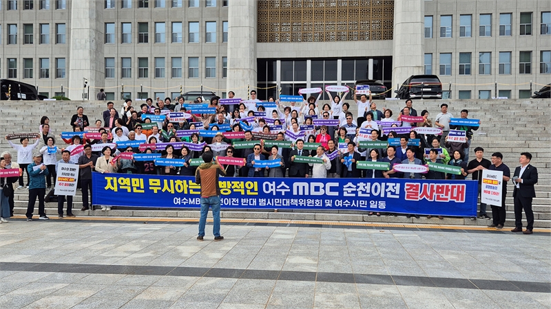 밀실야합 권언유착 여수MBC 순천이전을 규탄하는 여수시민의 함성이 서울 한복판에서 울려 퍼졌다. 여수시의회 백인숙 의장(공동위원장) 등 여수MBC 순천이전 반대 범시민대책위원회(이하 대책위)와 여수시민 200여 명은 14일 국회와 MBC문화방송(이하 MBC)을 항의 방문해 규탄 대회를 가졌다. 이들은 국회 국정감사 일정에