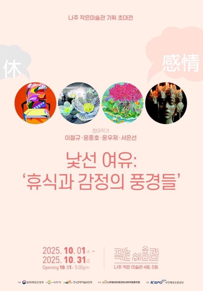 전라남도 나주시가 빠르게 변화하는 현대사회 속에서 잊혀진 ‘여유’의 가치를 예술로 되새기는 기획전을 선보이고 있다. 14일 나주시(시장 윤병태)에 따르면 지난 10월 1일부터 오는 31일까지 한 달간 나주 작은미술관에서 기획 초대전 ‘낯선 여유: 휴식과 감정의 풍경들’ 기획전을 개최하고 있다. 이번 전시는 빠른 일상과