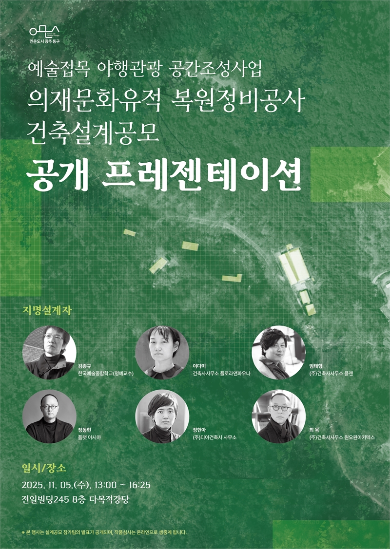 이들은 각각 의재문화유적의 복원 방향, 공간구성, 자연환경과의 조화, 방문객의 체험 동선 등 다양한 해석을 제시할 것으로 보이며, 심사위원과 함께 작품별로 차별성과 실현 가능성, 예술적 완성도 등에 대해 심도 있는 논의도 펼칠 계획이다.