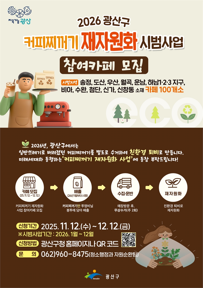 참여를 희망하는 커피전문점은 12월 12일까지 광산구 누리집이나 정보무늬(QR 코드)를 통해 신청하면 된다.