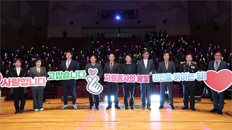 행사는 ‘자원봉사의 불빛, 강진을 밝히는 힘!’이라는 슬로건 아래 진행됐다. 관객석 뒤편에서 자원봉사의 불빛을 상징하는 ‘LIGHT’ 공 5개가 봉사자의 손길을 따라 무대 위로 전달되는 퍼포먼스가 펼쳐졌다. 이 퍼포먼스는 자원봉사자의 나눔의 손길과 그들의 빛나는 헌신을 의미하는 상징적인 장면이었다.