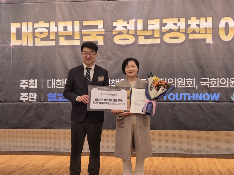 화순군(군수 구복규)은 23일 국회도서관 대강당에서 열린 ‘2025 대한민국 청년정책 어워즈’에서 청년 및 신혼부부 만원임대주택(이하 만원임대주택) 정책으로 ‘혁신상’을 수상했다고 밝혔다.
