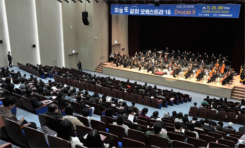광주전남공동혁신도시(나주 빛가람동) 이전 공공기관 임직원과 가족으로 구성된 ‘따로 또 같이 오케스트라 16’이 초겨울 밤 시민들에게 깊은 울림과 감동의 무대를 선보였다. 나주시(시장 윤병태)는 지난 25일 오후 7시 한국에너지공과대학교 대강당에서 ‘2025 따로 또 같이 오케스트라 16’ 연주회 ‘드보락 9’(DVORAK