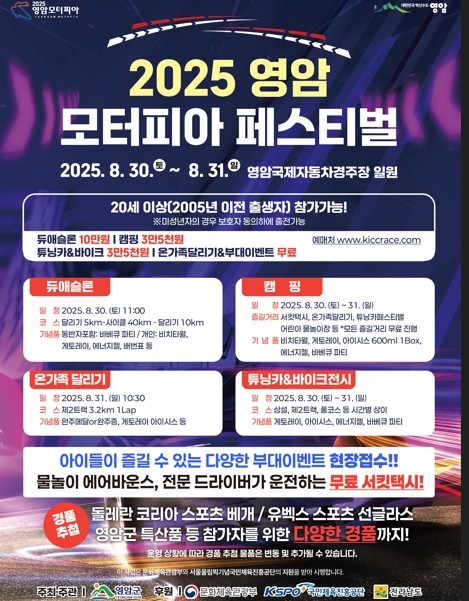 전남 영암군은 오는 30일부터 이틀간 영암국제자동차(F1)경주장에서 '영암 모터피아 페스티벌'을 개최한다. 이번 페스티벌은 체험형 문화 축제로 모터스포츠와 레저를 결합한 다양한 콘텐츠로 가족·친구·연인이 함께 즐기는 장이 될 것으로 보인다. 사이클과 러닝을 결합한 '듀애슬론', 전문 드라이버와 함께 실제 서킷을 주행하는