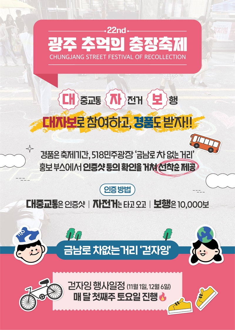광주 동구(청장 임택)는 오는 15일부터 5일간 금남로와 충장로 일원에서 열리는 제22회 광주 추억의 충장축제에서 ‘금남로 차 없는 거리’의 가치를 알리고 대자보 도시 정책에 시민 참여를 확대하기 위한 특별 홍보 이벤트를 진행한다고 밝혔다.‘금남로 차 없는 거리’는 올해 3월부터 자동차 중심이 아닌 사람 중심의 도시공간