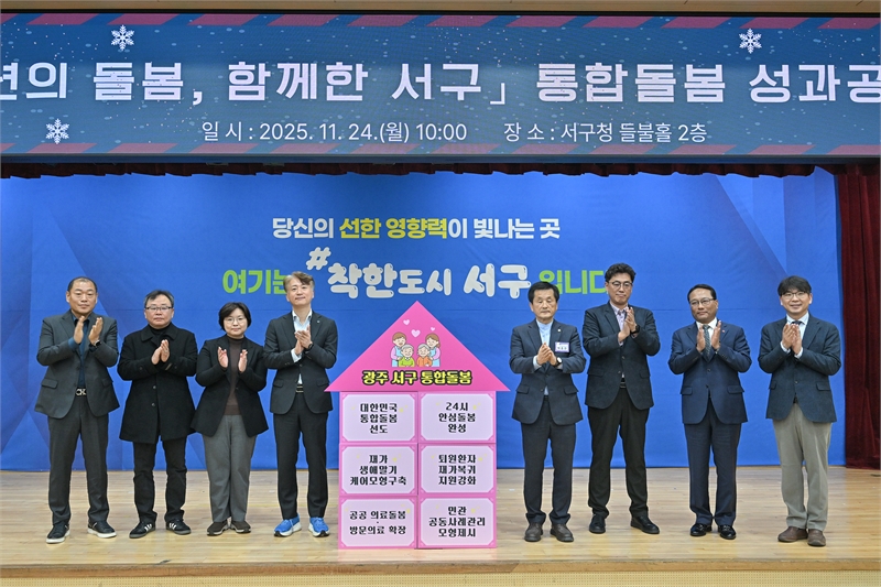 광주광역시 서구(구청장 김이강)는 24일 서구청 들불홀에서 ‘7년의 돌봄, 함께한 서구’를 주제로 통합돌봄 성과공유회를 열고 그동안의 주요 성과와 향후 과제를 공유했다.서구는 전국 기초지자체 최초로 ‘통합돌봄국’을 신설하고 의료·복지·주거·기술을 결합한 다양한 돌봄사업을 선도적으로 추진하며 지역사회 통합돌봄 분야에서 모