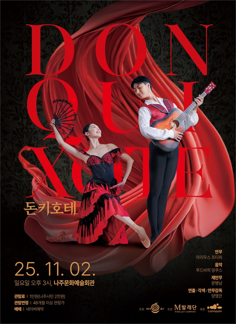 전라남도 나주시가 세계적인 고전 명작 발레 ‘돈키호테’를 지역 무대에 선보이며 시민들에게 수준 높은 문화예술 향연을 선사한다.나주시(시장 윤병태)는 한국문화예술위원회가 후원하는 ‘2025 우수 예술단체 유통지원 사업’의 일환으로 M발레단과 함께 클래식 발레 ‘돈키호테’를 공연한다고 29일 밝혔다. 이번 공연은 오는 11