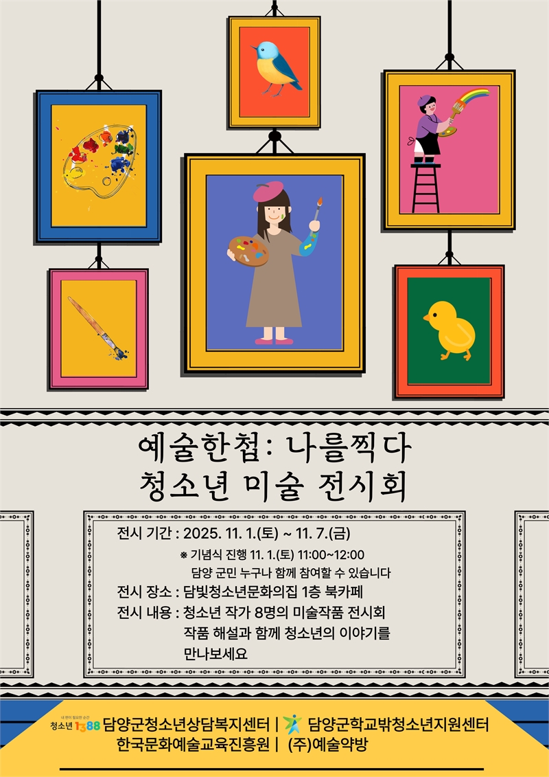 담양군청소년상담복지센터(센터장 손은아)는 11월 1일부터 7일까지 담빛청소년문화의집 1층 로비에서 청소년 미술작품 전시회 ‘예술한첩: 나를 찍다’를 연다. 이번 전시는 한국문화예술교육진흥원 ‘마음치유, 봄처럼’ 공모사업에 전남 22개 시·군 가운데 유일하게 선정된 담양군청소년상담복지센터와 학교밖청소년지원센터가 5월부터