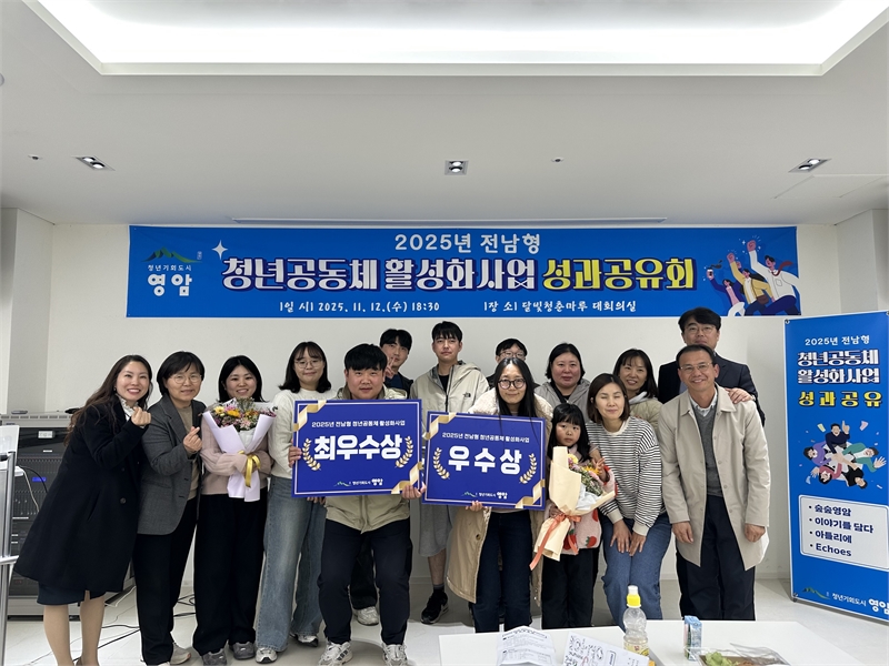영암군(군수 우승희)이 12일 영암읍 청년센터 달빛청춘마루에서 4개 청년공동체 구성원 등 20여 명이 참석한 가운데 ‘2025년 청년공동체 성과공유회’를 열었다. 이날 행사는 영암군의 ‘청년공동체 활성화 사업’에 참여한 단체의 올 한해의 성과와 경험을 공유하는 자리. 영암군은 청년들이 지역사회의 활동 주체로 성장하도록