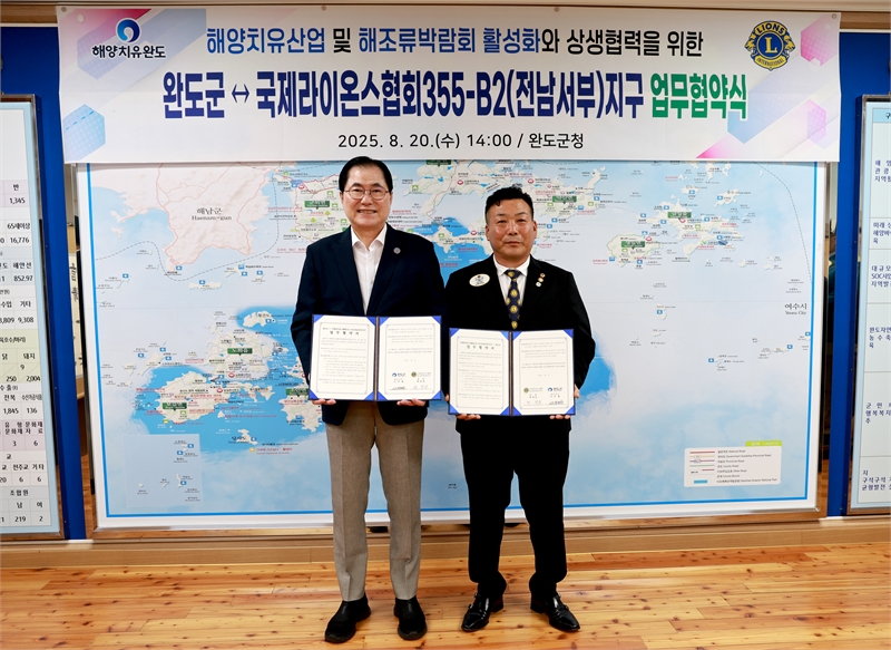 완도군(군수 신우철)이 국제라이온스협회 355-B2지구(총재 최경윤)와 해양치유산업 활성화 및 2026 Pre완도국제해조류박람회 성공 개최를 위한 업무 협약을 체결했다. 협약식은 지난 20일 완도군청에서 진행됐으며, 신우철 완도군수와 최경윤 총재를 비롯한 관계자들이 참석했다. 협약은 지역 핵심 산업인 해양치유산업 육