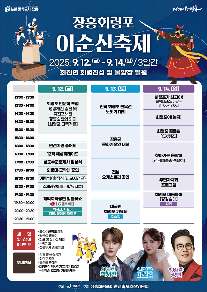 장흥군은 9월 12일부터 14일까지 3일간, 장흥군 회진면 회령진성 및 회진항 물양장 일원에서 2025 장흥 회령포 이순신 축제를 개최한다고 밝혔다.올해 축제는 역사적 의미를 되새기는 전통의례와 다채로운 문화예술 공연, 군민과 관광객이 함께 즐기는 참여형 축제로 꾸며진다. 특히 올해는 장흥문화역사관 특별전, 전남 오케스