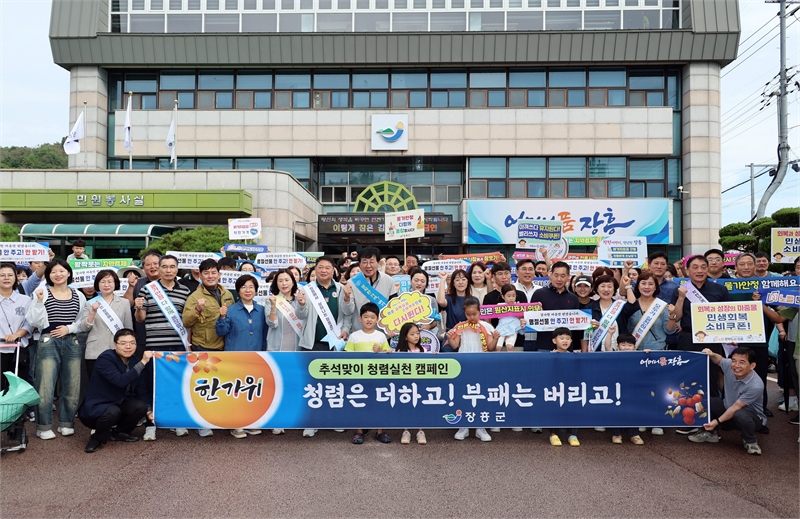 장흥군은 27일 추석 명절을 앞두고 정남진 장흥 토요시장 앞에서 ‘청렴 실천 캠페인’을 펼쳤다.이번 캠페인에는 군청 공직자 100여 명이 참여해 건전한 명절 문화 조성, 투명하고 공정한 행정 실현의 중요성을 홍보했다. 이날 공직자들은 스스로 솔선수범하여 청렴 실천을 다짐하며 군민 신뢰를 높이겠다는 의지를 표명했다. 장흥