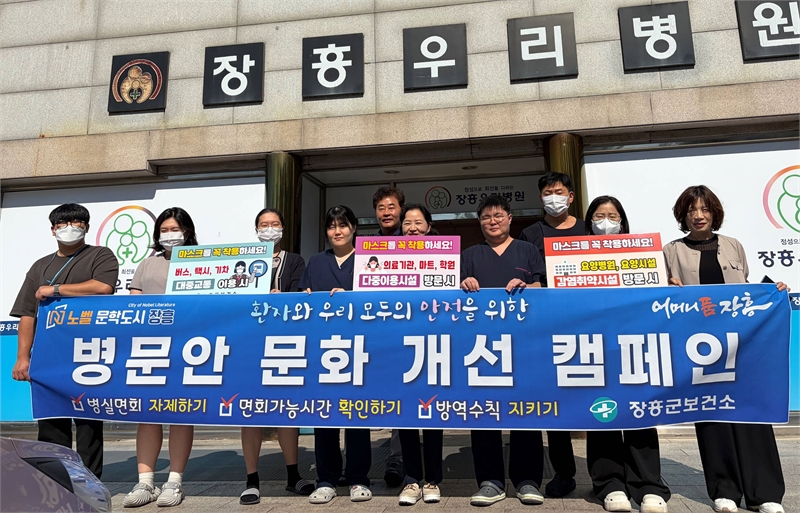장흥군은 추석 명절을 앞두고 연휴 기간 중 의료기관이나 요양 시설에 문병객이 많을 것으로 예상됨에 따라, 불필요한 병문안을 자제하는 분위기를 조성하고자 ‘병문안 문화 개선 캠페인’을 실시했다.이번 캠페인에서는 안전한 병문안을 위한 3대 원칙 ▲확인하기(병문안 가능 시간·장소·허용인원) ▲자제하기(감염병질환자, 발열, 기