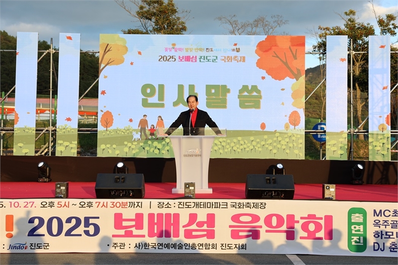 진도군은 10월 27일(월) 오후 5시에 진도개테마파크에서 ‘2025 보배섬 국화축제’ 개막식을 성황리에 개최했다고 밝혔다.개막식에는 김희수 진도군수, 박금례 진도군의회의장, 김인정 전라남도의원, 진도교육지원청 교육장, 농업인 학습단체, 국화산업화연구회반 회원과 화단국 위탁생산 농가, 주민 등이 참석해 축제의 시작을 함