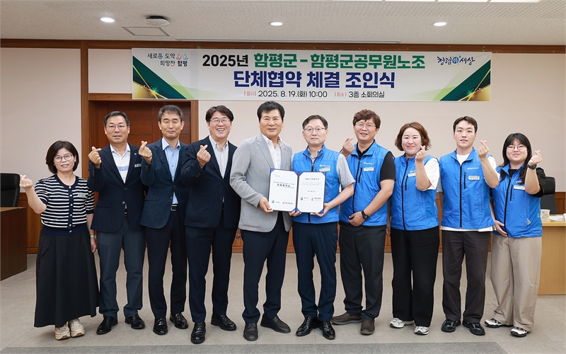 전남 함평군과 함평군공무원노동조합이 공무원 근무 여건 개선과 복지 향상을 위해 단체협약을 체결했다고 19일 밝혔다. 이날 단체협약 조인식에는 노사 양측 교섭위원 10명이 참여했으며, 이번 협약은 3월 노사 상견례를 시작으로 4차에 걸친 실무회의와 실무교섭을 거쳐 최종 합의에 도달한 값진 결실이다. 주요 협약 사항은 ▲