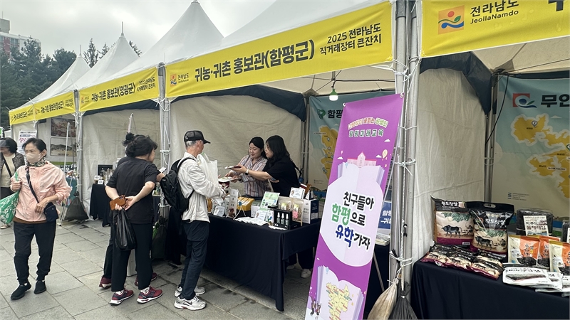 전남 함평군이(군수 이상익) 수도권 시민들에게 ‘살기 좋은 내 고장 함평’ 알리기에 적극 나섰다. 함평군은 지난 26일부터 28일까지 3일간 서울시 노원구 등나무근린공원에서 열린 ‘2025년 전라남도 직거래장터 큰잔치’에서 귀농·귀촌 홍보관을 운영했다고 29일 밝혔다. 이번 행사에서 귀농·귀촌 희망자들의 관심이 높