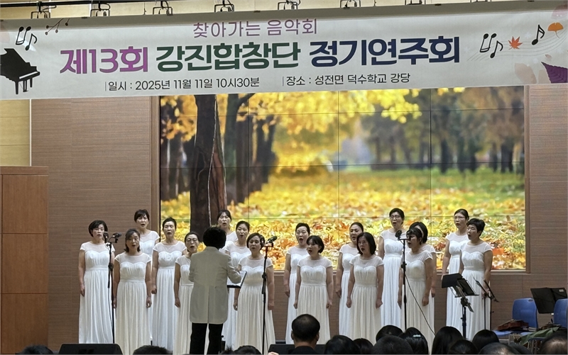 강진합창단(단장 김경숙)이 지난 11일 오전 강진군 덕수학교 강당에서 ‘제13회 강진합창단 정기연주회’를 개최했다. 이번 공연은 ‘찾아가는 음악회’를 주제로 군민과 함께하는 문화 소통의 장으로 마련됐다공연은 윤지현 교통방송 아나운서의 사회로 진행됐으며 지휘자 김송자와 반주자 박세미의 호흡 아래 ‘꿈꾸지 않으면’, ‘바람