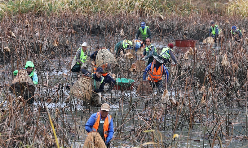 19일 오전 전남 강진군 병영면 중고저수지에서 주민들이 대나무를 줄로 엮어 만든 원통형 바구니인 ‘가래’로 물고기를 잡고 있다. 전통어업유산인 ‘가래치기’는 가래로 물고기를 가둬 잡는 방법이라 붙여진 이름으로 해마다 농사를 끝내고 저수지의 물을 뺀 뒤 물고기를 잡아 마을주민들이 한데 어우러져 잔치를 벌이고 있다./김오중