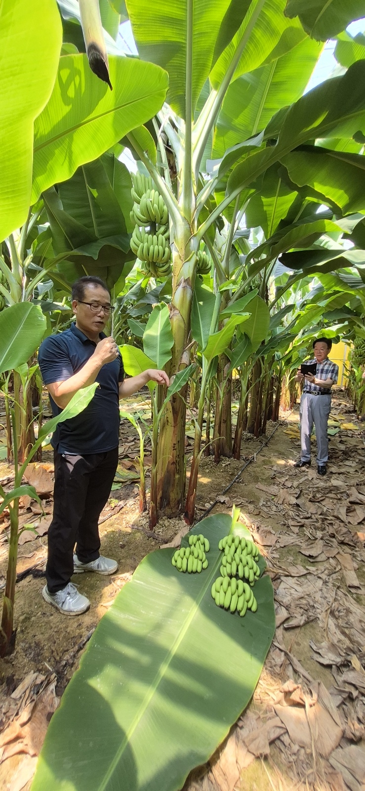 신안군 팔금면 바나나농장에서 농장 책임자인 정공우 씨가 바나나 첫 수확을 시작하고 있다. 1,800여 평의 농지를 갈아엎어 지난해 9월에 식재한 뒤 1년 만에 결실을 맺었다. 사진 앞쪽이 정공우 씨, 뒤쪽이 취재중인 최창식 기자달콤하고 향긋한 열대지방 바나나가 신안에서 첫선을 보였다. 상전벽해를 말해주듯 보잘것 없던 섬