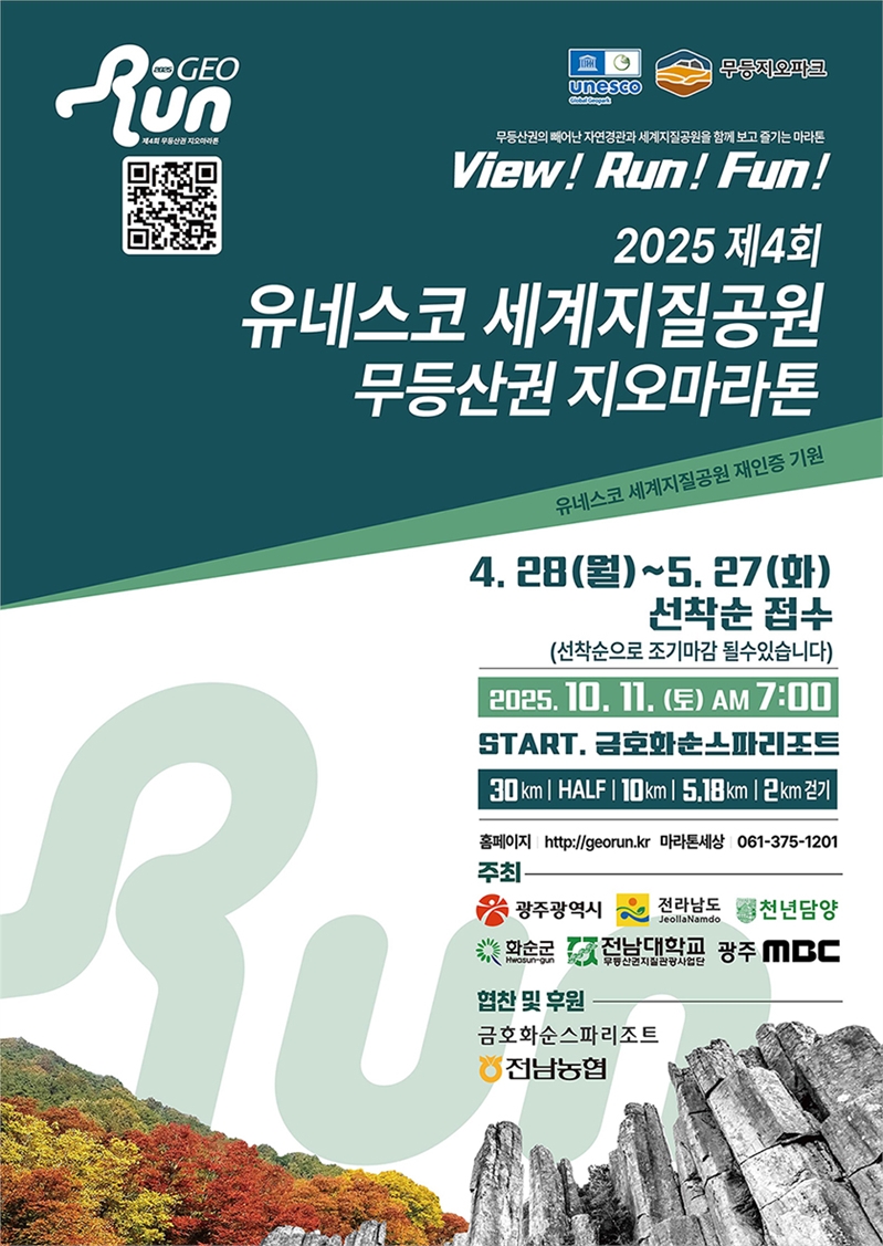 참가 신청은 대회 공식 누리집(http://georun.kr)를 통해 가능하며, 자세한 문의는 마라톤세상(061-375-1201)으로 하면 된다.