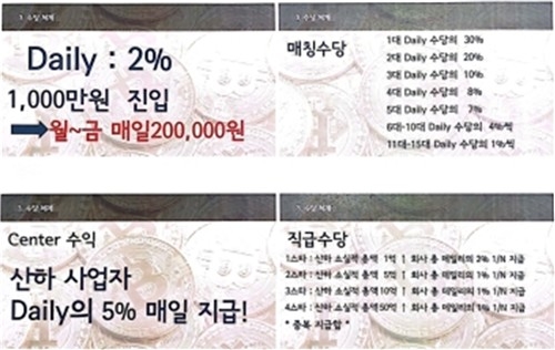 원금 보장과 동시에 매일 투자금 2%를 주고, 하위 투자자를 모집하면 추가 수당을 준다고 홍보해 1천440억원을 끌어모았다. 하지만 실제로는 후순위 투자자의 투자금으로 수당을 지급하는 전형적인 다단계 사기였다.