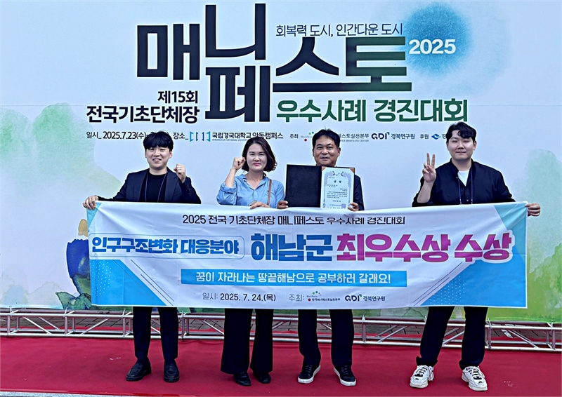 해남군이 2025 전국 기초단체장 매니페스토 우수사례 경진대회에서 최우수상을 수상했다.